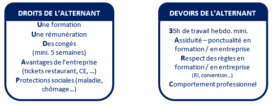 L’alternant est un salarié à part entière. À ce titre, les lois, les règlements et la convention collective de la branche professionnelle et celle de l’entreprise lui sont applicables dans les mêmes conditions qu’aux autres salariés. Le temps de travail est identique à celui des autres salariés. L’employeur doit permettre à l’alternant de suivre les cours théoriques professionnels. Ce temps de formation en CFA est compris dans le temps de travail effectif.
