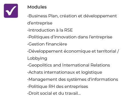 Modules de 15 ou 18 heures susceptibles d’évoluer en fonction de l’actualité régionale et internationale et des besoins des entreprises partenaires de l’ESC Amiens.
