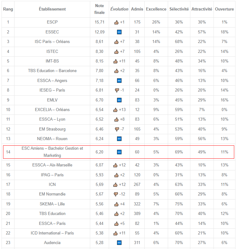 Le Bachelor de l'ESC Amiens classé 14ème sur les 57 programmes Bachelor de Parcoursup