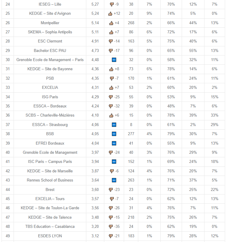 À partir des données récoltées sur ces critères, Business Cool a calculé un score normal centré réduit qui a été ramené sur 20. Pour chaque catégorie, la meilleure école de commerce obtient un 20/20, tandis que la dernière école obtient un 0/20. Une moyenne sur 20 est ensuite calculée et permet d’obtenir le score final. Voici l'intégralité du classement que vous pouvez également retrouver en cliquant sur ce lien.