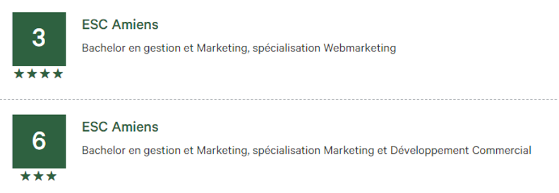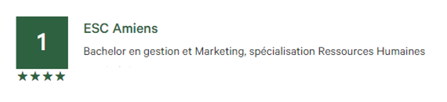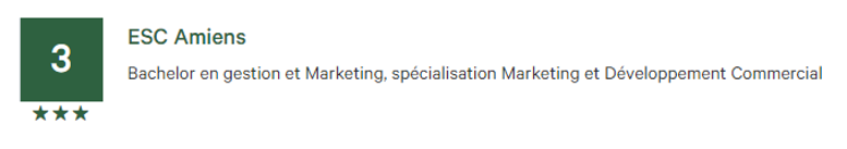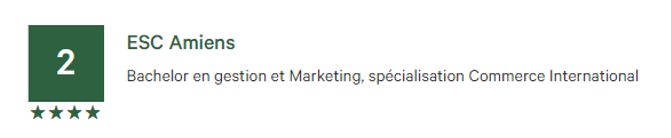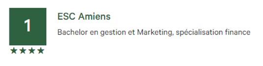 En 2024, l'ESC Amiens est fière de se retrouver classée au niveau national (cf. article dédié) et régional (Hauts de France). Les résultats complets du classement peuvent être consultés en cliquant ici, mais voici le détail du positionnement des 6 bachelors de l'ESC Amiens classés dans 6 spécialités au niveau national, ainsi que le classement du Bachelor en Gestion et Marketing et du Cursus Grande École (MGOE) :